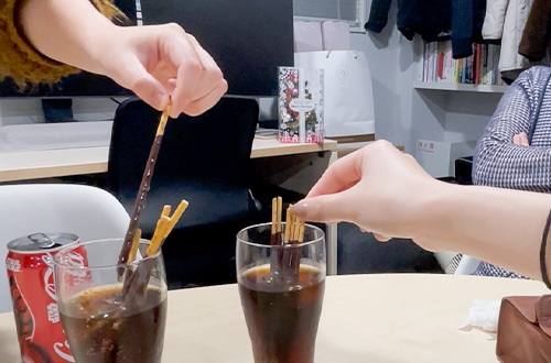 仕事中、急に始まった昔ながらのポッキーを食べ方!