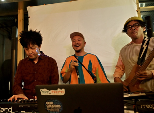 みなさんスケジュール多忙で、前日にようやく3人揃っての初スタジオとなりました。初めはリズムパートのみでしたが、ロックオン柳田さんの即興ボーカルが入るバージョンがハマり、本番もその形式になりました。